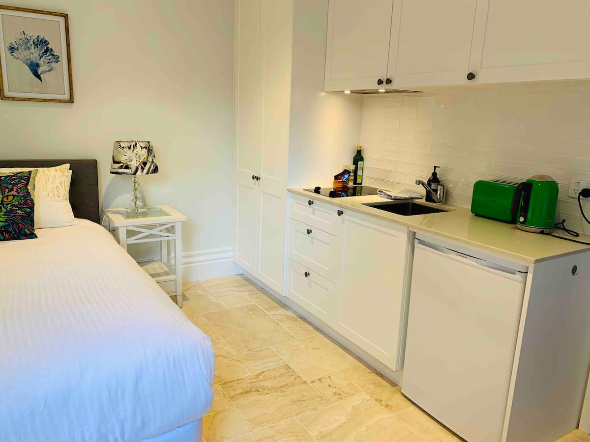 Kitchenette, Queen bed, built in robe, natural-stone bathroom, heated towel rail and underfloor heating. Smart TV. Shared washing Machine / Dryer facilities available.